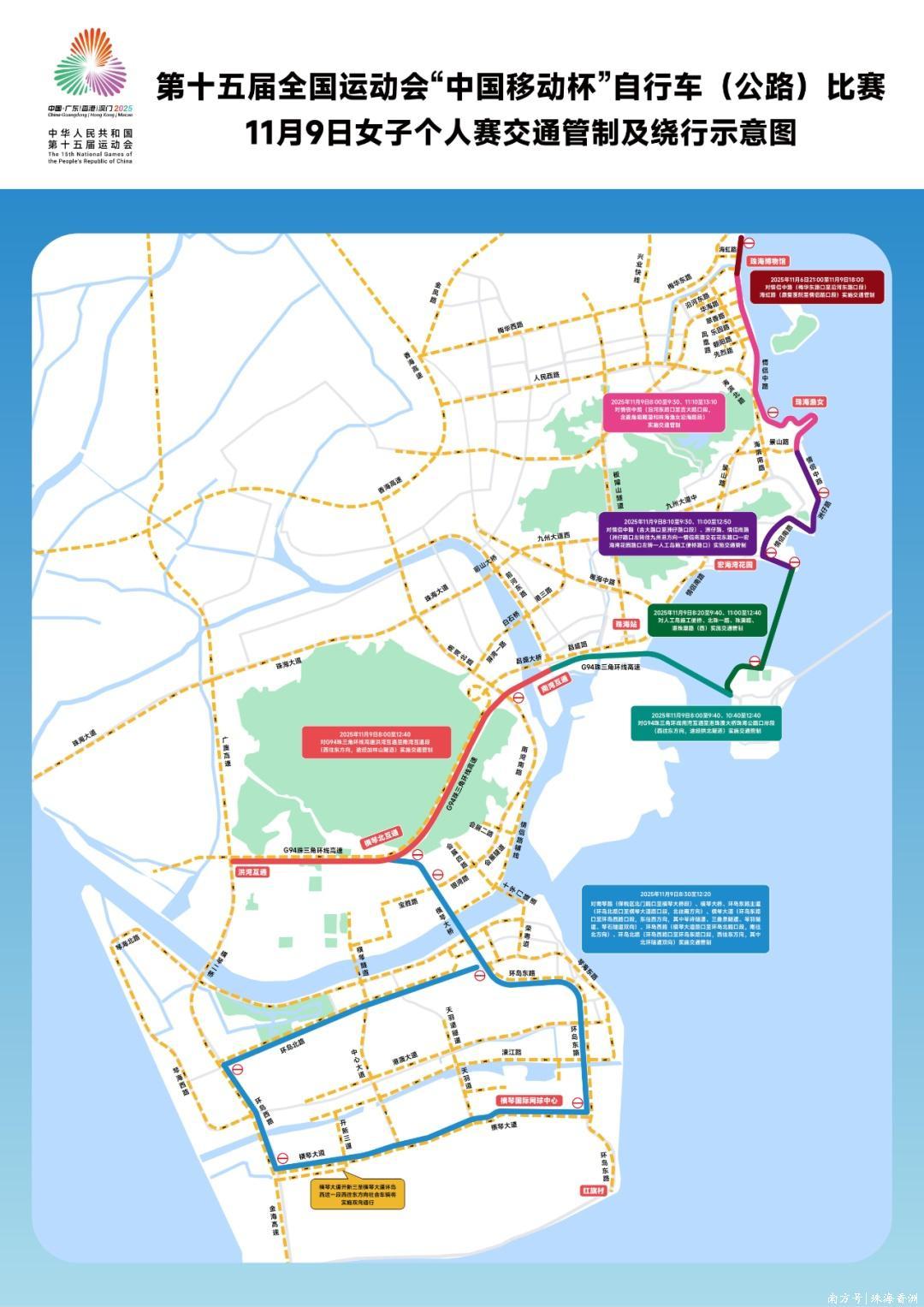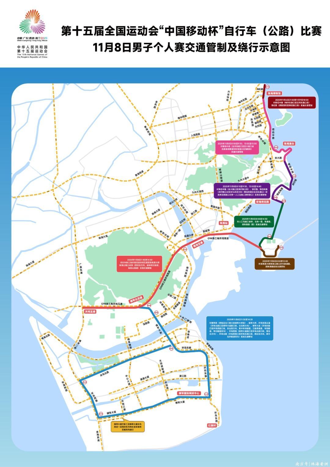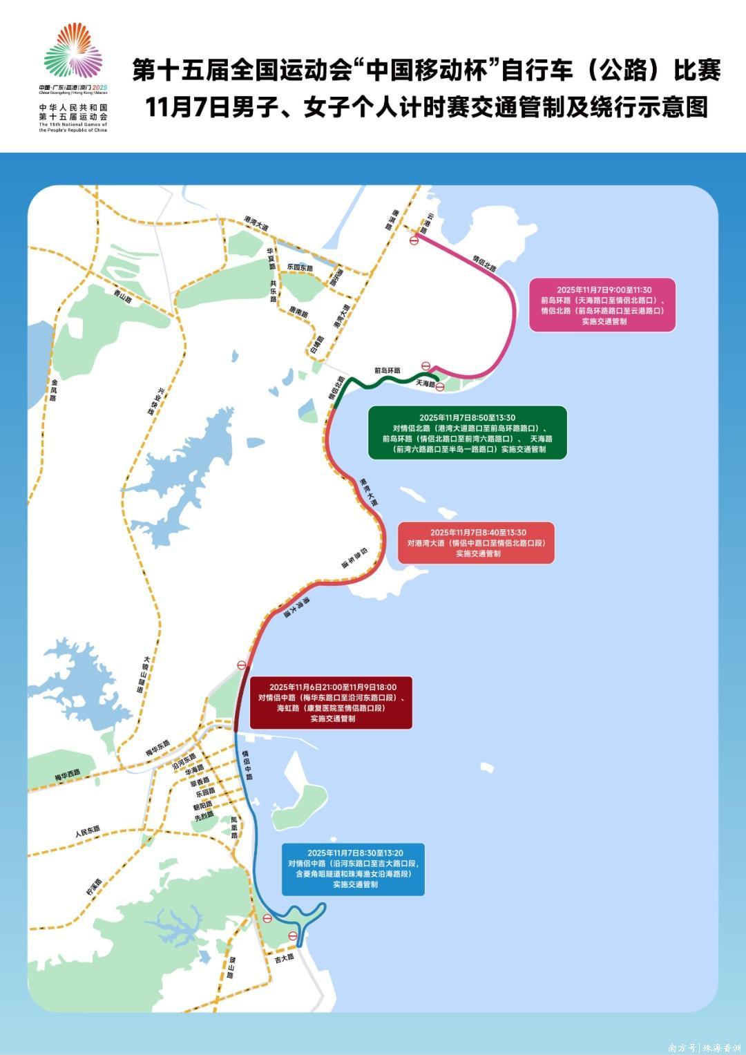 在男子个人赛中,参赛运动员将从珠海市博物馆与规划馆门前广场出发,途经港珠澳大桥、澳门北安码头、香港迪士尼乐园等地点,比赛期间将6次经过口岸。并且男子个人赛也是全运会史上赛道最长的自行车公路赛事。